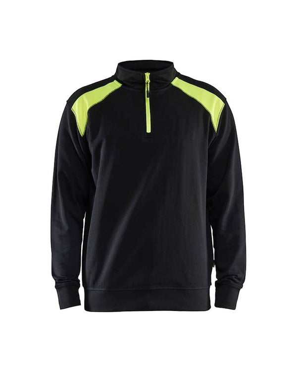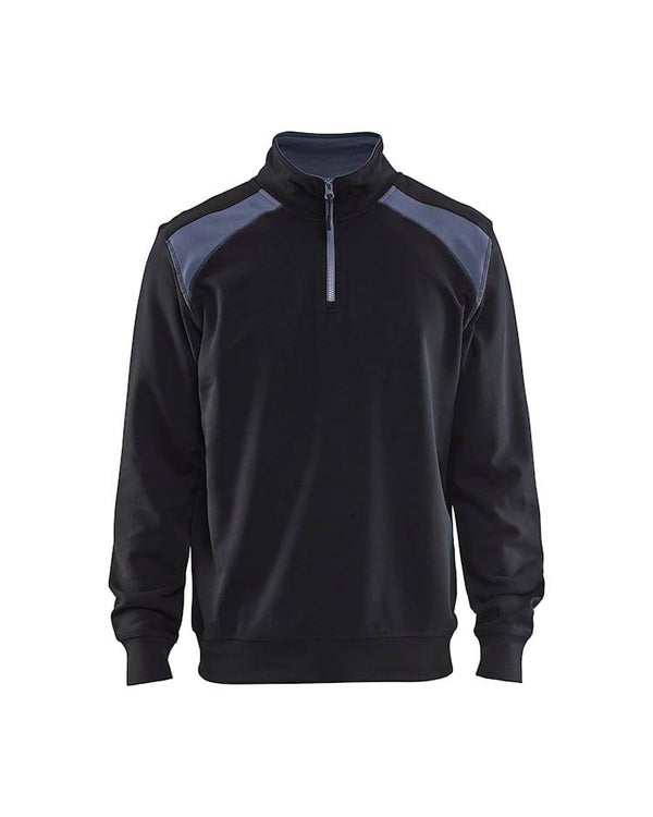 Een comfortabele en flexibele sweater in bi-colour met een hoge kraag en ritssluiting.Sluit perfect aan op de Industrie-collectie.